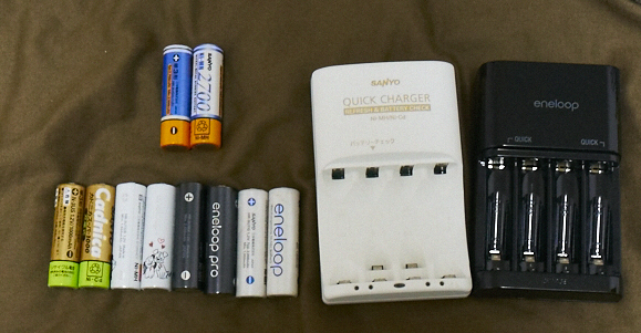充電池は三洋のものが一番良い。エネループの放電性能は異次元。充電器は三洋の上位にリフレッシュ機能付があるのでそれが安定。持っている人がいるかどうか分からないが、キムラタンの充電器は非常に性能が良い。ただしエネループが古くなってくると満充電ができなくなるエラーを起こしたという事例も報告されている。キムラタンの持ってないから欲しい。←
